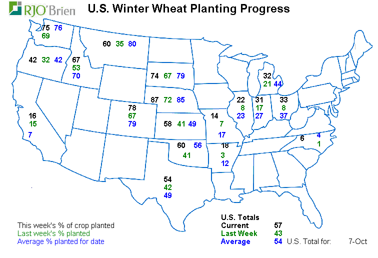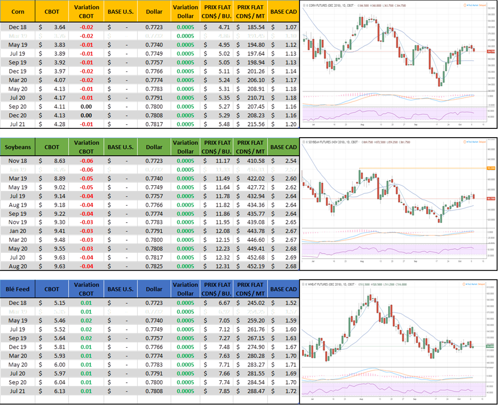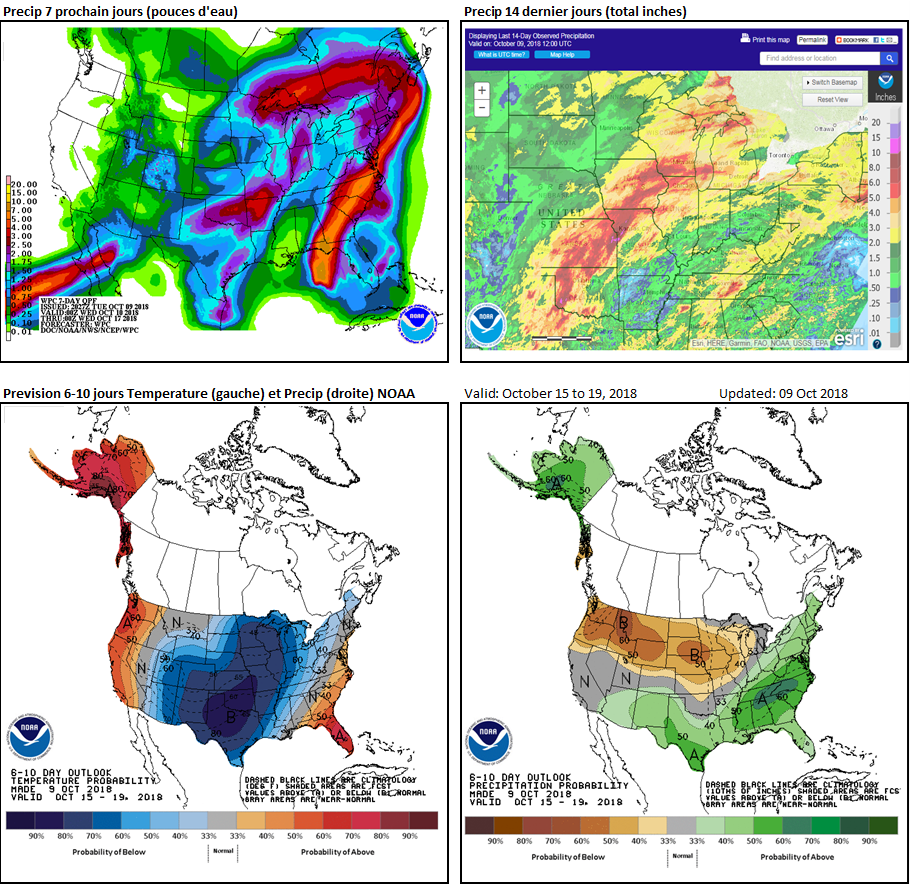 L’avance dans la récolte se fait rattraper par Dame Nature qui laisse beaucoup d’eau dans le Midwest. C’est bien pour l’émergence du blé d’hiver mais cela ralenti les battages de maïs et de soja. Depuis deux semaines il est tombé de 4 à 8 pouces d’eau dans le cornbelt; principalement dans les états clés comme Iowa et Illinois. Le temps plus frais de l’automne ralenti l’évaporation et les farmers doivent attendre un peu plus longtemps avant de retourner au champ. Par contre on ne craint pas pour les rendements et l’USDA devrait encore une fois nous le rappeler cette semaine. Nous avons un rapport Offre-Demande ce jeudi le 11 octobre.