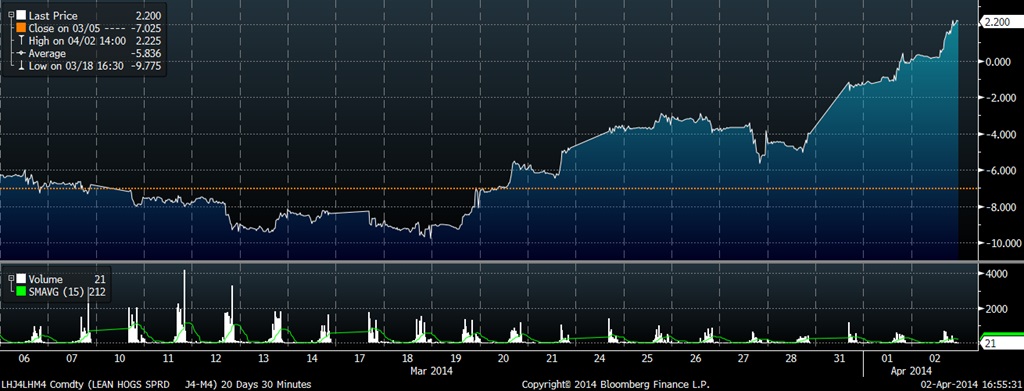 Au niveau de l’élevage les CAT de porc ont dégringolés de près de 3 cents sur la limite journalière. Nous sommes encore dans un environnement extrêmement volatile suite au rapport USDA de vendredi dernier qui disait essentiellement que la production n’était pas autant en baisse que le marché le croit. Et pourtant le prix demeure élevé, mais si l’USDA maintient sa position il est probable de voir la « balloune » dégonfler… Le Lean Hog Index (indice des prix cash) demeure élevé à 130.31, mais la composition de l’indice ne prend pas en compte toutes les journées qui ont suivi le rapport de vendredi. Le cash à 1.30 $/lbs met évidemment de la pression sur le contrat d’avril à rester haut, si bien que maintenant le prix spot est plus cher qu’en juin! Depuis un mois seulement, le contrat d’avril qui se négociait à discount de 10 cents vis-à-vis juin, il est maintenant à prime de 2.20 cents! C’est à se poser la question qui paie aussi cher aujourd’hui pour s’approvisionner !? Je joins un graphe de la différence de prix entre le CAT d’avril et celui de juin au bas.