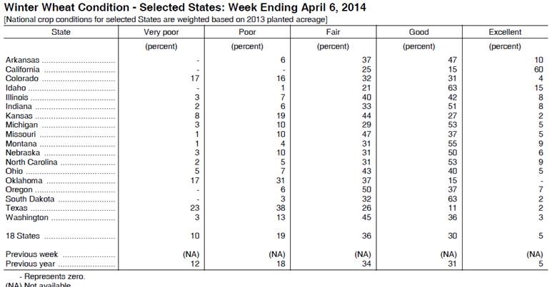 Crop Progress : Évidement aucunes données sur le corn et la fève, on surveille plus la qualité du blé d’hiver. Au total, on note que 35% du blé est de bonne ou d’excellente condition et de l’autre côté du spectre on parle de 29% de mauvaise ou très mauvaise condition. C’est une claire diminution alors qu’à l’automne nous avions 62% et 8% dans les catégories respectives. Cependant il est tout à fait normal de voir la qualité du blé baisser durant l’hiver puisqu’en comparant avec l’an dernier, nous sommes exactement au même point en terme de condition. Il faudra un peu plus de temps pour que la chaleur revienne au Midwest pour mieux évaluer les effets de l’hiver pour quantifier le winterkill.