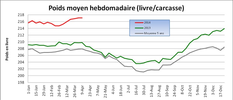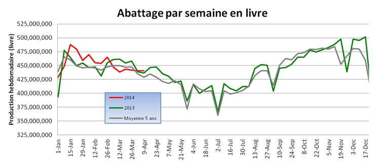 Lean Hog. A date cette semaine l’abattage est constant et le poids moyen des bête aussi, si bien que la production estimée par semaine est plus forte en 2014 qu’à pareille date l’an dernier et que des 5 dernières années aussi. Question de remettre en perspective, voici les prix de fermeture des CAT de juin (expiration mi-juin) depuis quelques années :