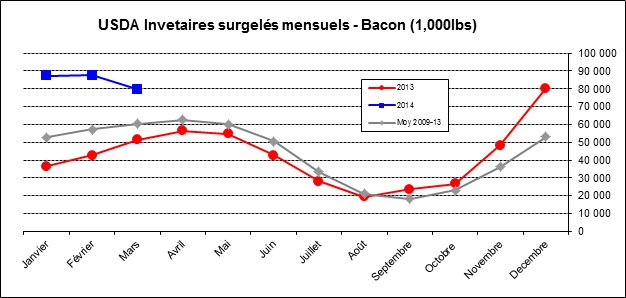 Tel qu’expliqué hier, les estimés pour le rapport des inventaires surgelés prévoient une augmentation de la quantité de porc à plus de 650 millions de livres surgelées ce qui auraient été 4% au-dessus de la moyenne 5 ans. Surprenamment, les stocks de porcs ont baissé à 575 millions de livres donc 11% de moins que l’an dernier et 12% de moins que le mois de février (graphique 1). Face au rapport, le marché n’a aucunement réagit : les prix n’ont pratiquement pas bougé et il y a eu à peine 400 contrats de transigés depuis 3h00 sur les livraisons de juin, soit 2% du volume d’aujourd’hui. Concernant la surprise, il semblerait que l’explosion du prix cash n’avait pas été causée par des achats massifs mais que le niveau des prix ait motivé à liquider les inventaires surgelés. La seule coupe qui est considérablement en hausse par rapport mars 2013 est le bacon à +55% à 79.7 millions de livres (graphique 2). Ce sont les coupes de basse qualité qui ont connu les plus forte baisse, soit les retailles (-46% à 36.9M lbs) et le non-classifié (-33% à 48M lbs).
