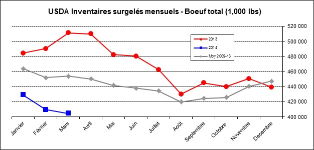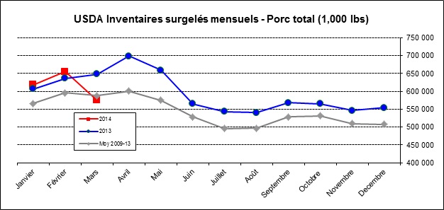 Du côté du bœuf, les inventaires tombaient dans les estimés lesquelles sont similaires aux inventaires du mois dernier. Ces réserves se chiffrent à 405 millions de livres qui sont tout de même 21% en dessous du niveau de mars 2013 (graphique 3). C’est un niveau historiquement bas ce qui devrait supporter le prix de la découpe ainsi que le contrat du mois d’avril qui expire dans une semaine.