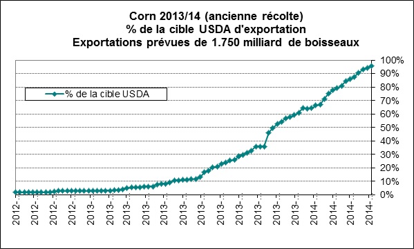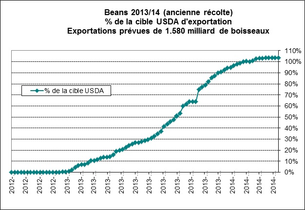 Il y a eu peu de variations dans le prix de maïs et du soya aujourd’hui en dépit des données sur les ventes à l’exportation. Dans le maïs, la demande extérieure était assez bonne la semaine dernière avec des ventes atteignant le hauts des estimés, avec 1 million de tonnes vendues. Sur cette quantité, 619,000 tonnes étaient pour l’ancienne récolte amenant le cumulatif à 43.1millions de tonnes, tout près de l’objectif de l’USDA pour la récolte 2013/14. À ce rythme, nous devrions surpasser les projections d’ici quelques semaines puisque nous sommes déjà à 97% des estimés de l’USDA (graphique 1). Par contre, on a déjà dépassé l’objectif dans le soya à 103.7% des 43 millions de tonnes prévues pour satisfaire la demande d’outremers, mais la cadence a grandement ralentit puisqu’on totalise seulement 177,000 tonnes en combinant les 5 dernières semaines (graphique 2). Finalement dans le blé, les ventes suivent les estimés avec 610,800 tonnes vendues dont 55% était pour l’ancienne récolte.
