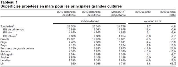 À l’échelle nationale, les agriculteurs canadiens s’attendent à semer moins de blé qu’en 2013, mais les superficies de soya et de pois secs devraient s’accroître. La superficie totale de blé pourrait diminuer de 4.8% pour s’établir à 24.8 millions d’acres pour la prochaine récolte. Chez le maïs-grain, la superficie ensemencée devrait s’établir à 3.4 millions d’acres ce qui est 8.7% moindre qu’en 2013. Essentiellement, l’Ontario devrait produire le 2/3 de maïs et près du tiers proviendra du Québec avec 958,800 acres. Dans le soya, c’est une augmentation de 16.5% par rapport à 2013 qui est attendue avec 5.3 millions d’acres découlant d’intentions record au Québec, en Ontario, en Saskatchewan et au Manitoba. Pour finir, le canola sera la deuxième grande culture la plus répandue après le blé avec 19.8 millions d’acres ce qui est semblable à l’an dernier mais constitue un baisse de 10% comparativement à 2012. Voir le tableau en annexe pour plus de détails.