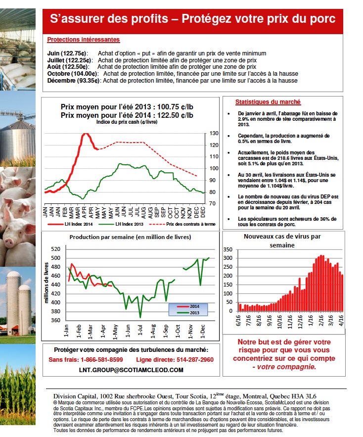 - Le prix cash s’écroule depuis que le marché connait la production prévue de 2014. En effet, le virus DEP a tué près de 7% de la production, mais la croissance des mises-bas est venue compenser une partie de la perte du cheptel.