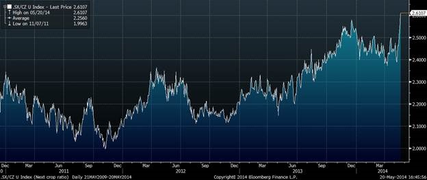 Aujourd’hui, nous allons regarder le ratio entre le prix du soya et du maïs qui est présentement à 2.61 pour la prochaine récolte et à 2.52 pour la récolte 2015/16.
