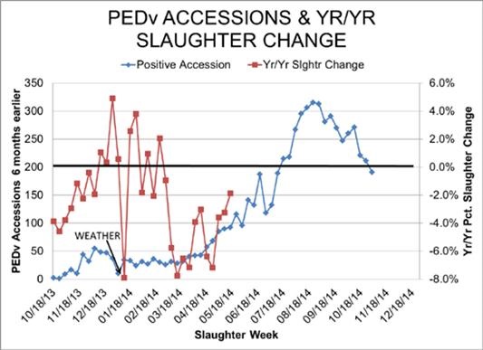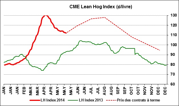 La dernière mise à jour des nouveaux cas positifs du virus DEP était à 189 cas, en baisse pour une 4ème semaine consécutive. Bien que le virus semble se répandre plus lentement que cet hiver, on va savoir dans quelques semaines le réel impact sur la production. La semaine dernière, le volume d’abattage était inférieur à 2013 de moins de 2% alors que 6 mois auparavant, les nouveaux cas répertoriés se chiffraient à 100 (graphique 1). La contamination du cheptel avait atteint son apogée au mois de février ce qui devrait affecter d’avantage la production du mois d’août… on voit déjà que le marché en tient compte puisque le contrat pour août est le plus élevé des contrats d’été à 128.5¢/lb. D’une autre perspective, le contrat du mois d’août est 17¢/lb de plus que le prix cash ce qui est une prime assez importante lorsqu’on voit qu’avec 100 cas par semaine, la production en livre de viande est supérieure à l’an dernier (+4.6% la semaine dernière). Si le poids reste au niveau actuel, les abattages pourraient diminuer de 7.5% avant que la production diminue, bien qu’il soit surprenant que les porcs continuent d’engraisser au même rythme lorsque les températures seront très chaudes. Par contre, n’oubliez pas que le prix du maïs a baissé de 8% ces 2 dernières semaines, diminuant les coûts de production. Tout cela réuni laisse beaucoup d’incertitude dans les marchés, créant une hausse de prix pour le mois d’octobre qui se transige au-dessus de 108¢/lb, presqu’au même niveau que le prix cash d’aujourd’hui ! Présentement, il est possible de protéger une plus-value importante par rapport les prix de 2013 (graphique 2), particulièrement pour les mois de juillet à octobre.