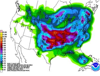 Le prix du maïs se transigeait encore à la baisse aujourd’hui avant de finir la journée avec un rebond pour retourner au niveau initial. On pouvait lire que le marché s’attendait à près de 63% de la récolte qui soit en bonne condition, comme l’an dernier à pareil date. En parallèle, certains parlaient même de rendement dans le haut des 160 boisseaux/acre (i.e. 168 – 169) ce qui semble très élevé... L’USDA estime que 63% de la récolte de maïs est bonne et 13% est excellente, pour une somme à 76%. Par contre, il ne faut pas capitaliser trop vite sur ces données à cette période de l’année puisque la récolte avait commencé de la même façon en 2012 (à 77%) avant de finir avec seulement 24% en bonne condition. Bien que l’an dernier la récolte ait commencé avec 63%, le sol était encore endommagé par la sécheresse de l’été 2012, il est donc « normal » d’avoir une meilleur condition cette année avec beaucoup d’humidité dans le sol. Concernant les autres données, 95% du maïs est planté où un léger retard persiste dans le nord du Cornbelt. Aussi, 80% de maïs est émergé, en ligne avec la moyenne des 5 dernières années. Du côté de la fève, on est un peu plus avancé que prévu, avec 78% de la récolte d’ensemencée et 50 % émergée, en avance de quelques jours sur la moyenne des dernières années.