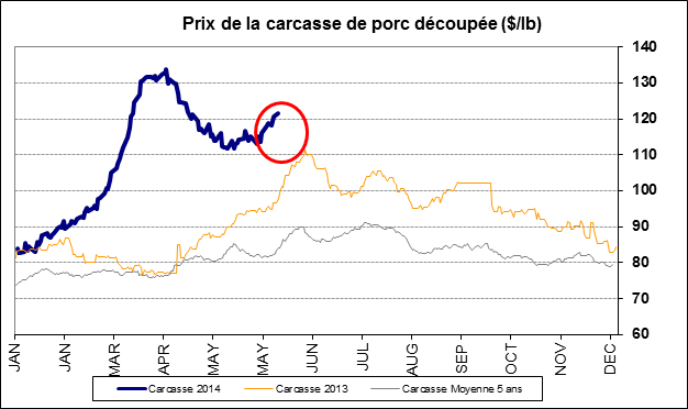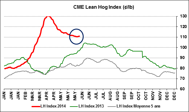Au niveau du porc, le prix de la découpe connaît une remonté depuis la fin mai, passant de 1.13$/lb à 1.22$/lb (graphique 1) en raison d’une demande plus forte en provenance des consommateurs… la saison des grillades est commencée! Pendant ce temps, le prix cash est resté immobile au tour de 1.11$/lb, augmentant la profitabilité des abattoirs qui était négative d’avril à la mi-mai. L’écart entre le prix de la découpe et celui du prix cash dépasse rarement le 10¢/lb avec une moyenne de 3¢/lb depuis 2009. Cela explique pourquoi le prix du contrat de juin qui expire vendredi prochain se transige à 1.15$/lb alors que le dernier indice du prix cash est à 1.11$/lb (moyenne des prix de jeudi et vendredi), le marché s’attend à un rebond du prix cash suite à une demande plus forte des abattoirs cette semaine.
