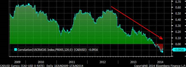 Aujourd’hui, nous allons parler du taux de change, particulièrement de la relation entre le prix du baril de pétrole et le dollar canadien. Historiquement, cette relation était fortement positive, mais ce n’est plus le cas depuis plusieurs mois.
