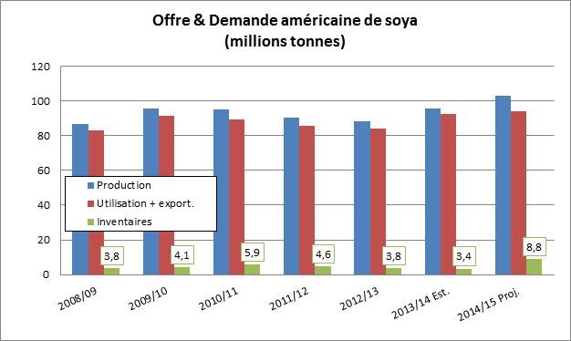 Comme vous le savez, la situation actuelle est plutôt serré sur les marchés américains ce qui maintient les prix locaux de soya élevés en dépit des inventaires mondiaux. Cependant, si la météo continue d’être clémente, la récolte de soya américaine devrait être la plus grosse jamais réalisée, dépassant 100 millions de tonnes (graphique 2). Cela ramènerait les inventaires américains dans une situation beaucoup plus confortable à près de 9 millions de tonnes. Le consensus du marché tourne au tour du 10$/boisseau si les estimés du l’USDA se réalisent ce qui ferait inévitablement baisser le prix de la récolte 2015/16.