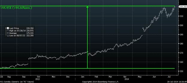 À la fermeture de vendredi, l’USDA publiait les données en parcs d’engraissement au 1er juillet lesquelles démontraient un plus petit troupeau qu’espéré, ce qui devrait continuer à supporter les prix du bœuf pour 2014. Au 1er juillet, il y avait 10.13 millions de bêtes dans les parcs, soit -2.4% par rapport l’an dernier, en dessous des estimés de -1.9% (graphique 1). Cela devrait engendrer une offre plus faible dans la période des fêtes où la demande est relativement forte. Cependant, l’attention se concentrait sur les placements lesquels restent très faibles, ce fût les plus petits placements depuis 2009 pour un mois de juin à 1.49 million de têtes, en baisse de 6.2%. En plus de placer moins de bêtes en parc, ils sont plus légers ce qui étira la période de commercialisation dans quelques mois. Les placements de veaux en dessous de 600lbs ont augmenté de 13% depuis un an, comparativement à une baisse de 14% dans les 700lbs et plus. Par ailleurs, dans le sondage semi-annuel d’inventaires bovins, on y trouvait le cheptel de veaux qui est 2.1% plus faible que 2012 à 4.1 millions de têtes : le processus d’expansion des troupeaux est relativement lent et l’offre de bovin d’engraissement (feeder) devrait rester serré jusqu’en 2016. En raison de cette faible expansion, le prix du feeder continue son ascension avec un gain de 2¢/lb aujourd’hui, franchisant un nouveau record à 2.20$/lb, une hausse de 44% depuis les 12 derniers mois (graphique 2). En plus du fondamental très positif pour le prix du feeder, la tendance reste extrêmement forte. Tel que nous l’avons déjà précisé, protéger ses achats futurs de bovin semble très intéressant pour les prochains mois.