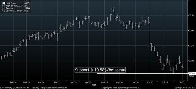 Soya : -9 ½ à 12.15 sur août et -23 ½ à 10.58 ½ sur nov. 2014