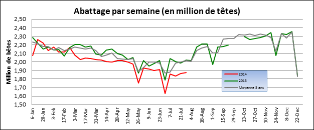 Finalement, un petit mot sur les abattages de porc. Jusqu’à hier, nous étions en avance de 1.6% sur les abattages de la même semaine en 2013, ce qui était très encourageant et mettait de la pression sur le prix d’août. En revanche, les abattages étaient médiocres pour aujourd’hui et demain, à peine 264,000 porcs contrairement à 439,000 l’an dernier. De la sorte, on se retrouve en baisse de 7.4% ce qui continue à s’ajouter sur les mauvais volumes des 5 dernières semaines (graphique 4). Avec un poids moyen de plus de 213.5 livres, la production en livres se retrouve 2.6% plus faibles que l’an dernier. Par ailleurs, l’indice sur la performance des restaurants américains ralentie à 101.30, démontrant que l’industrie continuait d’être en expansion en juin, mais de façon plus modéré qu’au mois de mai.