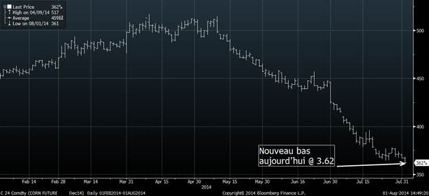 Maïs: -4 ½ à 3.52 ½ sur septembre et -4 ¾ à 3.62 ½ sur déc. 2014