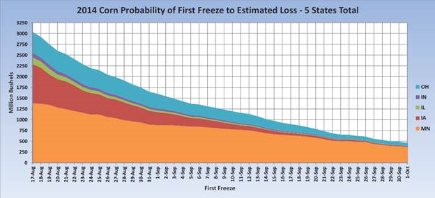 Alors que le taux d’humidité des terres semble parfait, ni trop sec, ni trop humide (graphique 1), les précipitations de cette semaine continueront d’être favorable pour les cultures. Cependant, la présence de températures nuptiales très basses (graphique 2) inquiète le marché au cas où un gel au sol hâtif subviendrait dans les prochaines semaines si la tendance météo se poursuit. Moindrement qu’un gel au sol surviendrait avant la mi-septembre, cela engendrait une perte d’un moins 1 milliard de boisseaux pour la région du Cornbelt (graphique 3) et de 500 millions si le premier gel survient avant le 1er octobre. Essentiellement, le Minnesota serait l’état le touché par un gel hâtif en raison du délai lors des semis.
