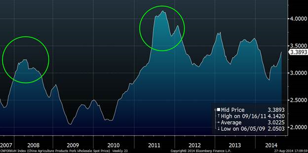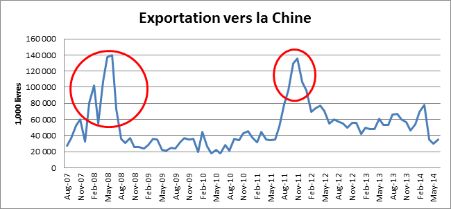 De plus, des nouveaux cas sont apparus près de la Chine, sur l’île de Taiwan, pour un cumul de 34 cas depuis décembre, éparpillés sur l’île. Le risque est présent que le virus rentre en Chine et cela pourrait causer des dommages importants considérant que ce pays produit 5 fois plus de porc que les États-Unis. Par ailleurs, avec les sécheresses dans le nord-est du pays ayant causé une appréciation du prix des grains, la production de porc pourrait diminuer dans la prochaine année. En raison des coûts élevés, plus de 2.5 millions de truies ont été envoyées aux abattoirs entre avril et juillet, rétrécissant le nombre de truies de 9.1% comparativement à l’an dernier. Depuis novembre dernier, le cheptel chinois s’est contracté de 8.1% ou 35.5 millions de cochons, c’est plus que la production annuelle du Canada. En conséquence, le prix avait baissé de 20% durant les 4 premiers mois de 2014 (graphique 2), mais ils ont rebondit depuis suite au resserrement de l’offre qui devrait reste pour longtemps. À cela s’ajoute la nouvelle demande en provenance de Russie ce qui pourrait supporter la récente augmentation. Autrement dit, les ventes américaines vers la Chine pourraient s’amplifier telles qu’en 2008 et 2011 lorsque les chinois achetaient plus de 100 millions de livres mensuellement (graphique 3).
