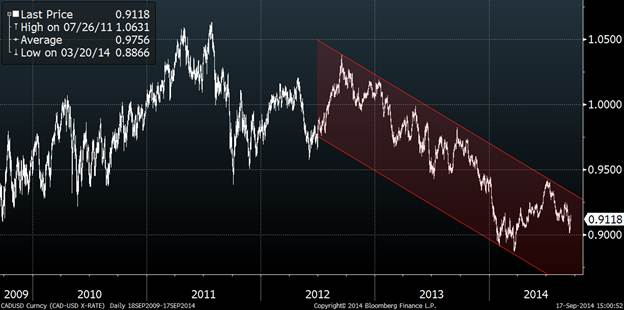 Mme Yellen, présidente de la Réserve Fédérale Américaine, a annoncé que les taux d’intérêt aux États-Unis devraient augmenter jusqu’à 1.375% d’ici la fin 2015 et atteindre 3.75% en 2017. En théorie, une hausse des taux d’intérêt engendre une augmentation de la demande pour la monnaie en question (ici le $US) en raison d’investissements supplémentaires, ce qui s’avérerait négatif pour le taux CAD/USD (présentement à 0.909). Sur les marchés agricoles québécois, une baisse du taux de change fait augmenter les bases puisque le prix des grains est listé en dollar américain. Autrement dit, la valeur de remplacement augmente, rendant les américains moins compétitifs à exporter vers le Canada. Depuis quelques temps déjà, les perspectives économiques s’améliorent aux États-Unis alors que la situation est au statuquo au Canada, mettant de la pression baissière sur le taux de change depuis 2 ans (graphique 1).