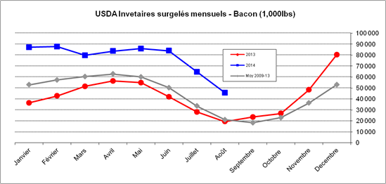 Après avoir vu des inventaires surgelés de porc 16.7% plus faible en avril 2014 qu’en 2013, ce déficit a pleinement été rempli et pour la première fois depuis février, il y a plus de porc surgelé que l’an dernier (graphique 1) avec 546.3 millions de livres. Dans la majorité des coupes, les réserves se situent en ligne avec la moyenne 5 ans ou avec les données de 2013, à l’exception du bacon. Les porcs bien bedonnants ont fourni une bonne quantité de bacon cet été et nous continuons d’être largement au-dessus de la normale à 45.5 millions livres soit 136% de plus que l’été dernier (graphique 2). Dans le bœuf, les inventaires surgelés ne cessent de chuter depuis le printemps 2013, passant de 510 millions de livres à 343.66 millions (-32.6%) en l’espace de 17 mois (graphique 3). Depuis les 12 derniers mois, les inventaires de bœufs surgelés ont baissé de 20%, amenant les inventaires de viandes rouges en baisse de 7.1% pour la même période.