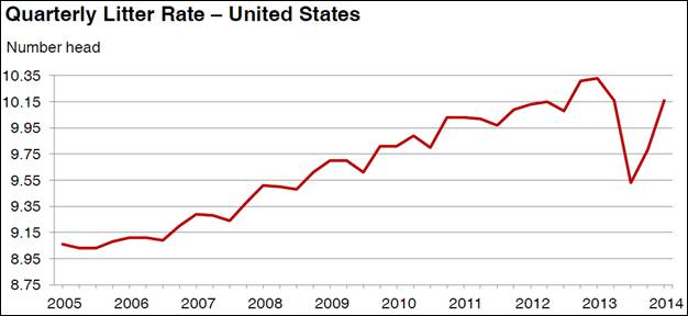 Dans le rapport trimestriel sur l’industrie porcine des États-Unis, on constate que le cheptel global est plus gros que prévu avec 65.36 millions de porcs, surpassant les estimés. D’une part, la partie du cheptel gardée pour la reproduction est de 5.92 millions de truies, un sommet depuis juin 2009. Cette hausse concorde avec les intentions de mises-bas pour les prochains 6 mois que devraient être en hausse de 4% comparativement à l’année précédente, reste à voir si la diarrhée épidémique porcine affectera encore une fois le nombre de porcelets par portée. On note que le nombre de porcelet par portée s’est nettement amélioré (graphique 1) depuis l’hiver dernier, retournant au-dessus de 10 porcelets par mise-bas ce qui avait été sous-estimés par les analystes de l’industrie. Cette variable reste la plus incertaine pour les prochains mois, il faudra suivre de près les nouveaux cas de virus DEP lorsque la température diminuera au courant de l’automne.