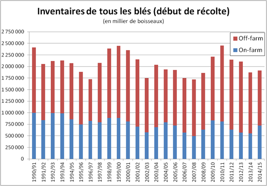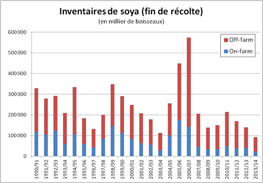 Aujourd’hui, c’était la publication du rapport trimestriel sur les inventaires de grains, représentant les inventaires de fin d’année 2013/14 pour le soya et maïs ainsi que les inventaires de début d’année 2014/15 pour les blés et l’avoine. Alors que le niveau des stocks est confortable dans le maïs et les blés, nous avons les plus faibles réserves de soya depuis 1973 en date du 1er septembre, et le deuxième plus bas niveau d’inventaires d’avoine historiquement, juste au-dessus de l’an dernier.