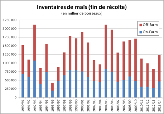 L’USDA a rehaussé la production de soya de l’année dernière (2013/14) après une réévaluation des superficies et du rendement répertoriés. Le rendement de l’an dernier passe donc de 43.3 boisseaux/acre à 44.0 boisseaux en plus d’une augmentation de 384 000 acres récoltées, ce qui résulte à une augmentation totale de la production de 69.2 millions de boisseaux… il semblerait que l’USDA avait oublié de comptabiliser 2% du soya l’an dernier, rien de moins! Bref, cela nous amène à des inventaires de fin d’année (1er septembre 2014) de 92 millions de boisseaux (graphique 1) soit le plus faible niveau depuis 1973. Dans le maïs, les inventaires pour la fin d’année 2013/14 sont comptabilisées à 1.236 million de boisseaux (graphique 2) ce qui est supérieur aux estimés de 1.191 million et de la projection précédente de 1.181 million par l’USDA. C’est légèrement négatif pour le prix de maïs puisque ce « surplus » s’additionnera à l’offre de cette année, mais l’augmentation des inventaires représente seulement 0.04% de la production actuelle. L’effet est donc marginalement faible.