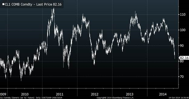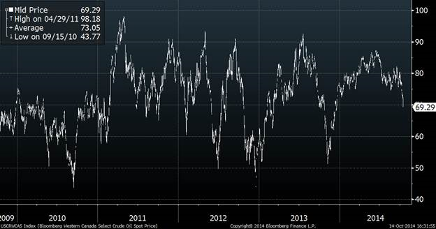 Le taux CAD/USD a baissé de 80 points pendant la séance d’aujourd’hui, entrainé par la chute du prix du baril de pétrole à New York et à Calgary. Le prix du pétrole brute américain est à son plus bas niveau depuis 28 mois à82.12$/baril alors que celui des sables bitumineux albertains a également baissé de 4% à 69.30$/baril. La contraction du prix de l’énergie est principalement due à des perspectives de croissance mondiale plus faible qu’anticipées il y a quelques mois ainsi qu’une production mondiale qui bat à plein régime. Techniquement, le dollar canadien n’est plus supporté et reste dans une tendance baissière depuis 2012 ce qui pourrait être risqué pour les acheteurs de grains.