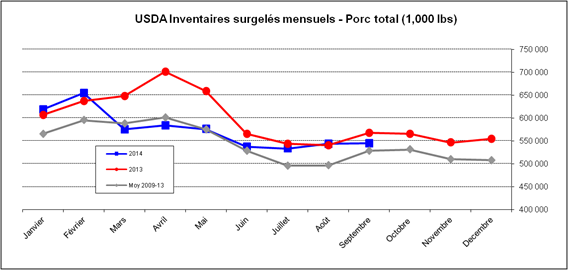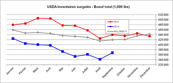 Au 30 septembre, la quantité de porc dans les congélateurs américains se chiffrait à 555 millions livres, pratiquement inchangée depuis 4 mois (graphique 1). Pendant toute l’année 2014, les inventaires de bacon restent très élevés étant donné le poids des carcasses, mais on connait un retour vers la normale. Alors qu’il y avait 135% plus de bacon en inventaire à la fin août, on est tombé à 44% de plus que l’an dernier (graphique 2) pour le mois de septembre, nous gardons donc de bonnes réserves mais la situation se rentabilise. Dans la viande de bœuf, on reste toujours dans des niveaux très faibles malgré un renflouement pendant septembre avec un total de 373 millions de livres (graphique 3). Il faut préciser qu’en août dernier, nous étions au plus bas niveau d’inventaires depuis 2005 démontrant que l’offre n’est pas seulement serrée dans les parcs d’engraissement.