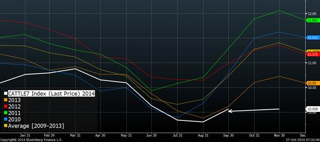 Vendredi dernier, l’USDA mettait à jour la situation en parc d’engraissement dont les chiffres étaient en ligne avec les estimés du marché. Pour un 26ème mois consécutif, il y avait moins de bœuf en parc d’engraissement au 1er octobre dernier qu’en 2013 avec 10.06 millions de têtes (graphique 1). Ce qui a aidé fût des placements au-dessus des niveaux de l’an dernier à plus de 2 millions de bêtes, renflouant un peu les inventaires en parc. En somme, le rapport est considéré « neutre » pour les prix.