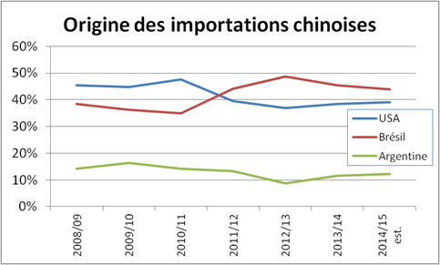 Dernièrement, la Chine a mis à jour ses chiffres pour l’année commerciale 2013/14 où on remarque des importations de soya plus fortes qu’anticipées par l’USDA, à 70.36 millions de tonnes métriques. Cela se traduit par une augmentation de 10.5M tonnes en une année, soit une croissance de 17.5% (graphique 2). De plus, la tendance devrait rester positive puisque les projections pour 2014/15 sont à 74 millions tonnes. On note que la Chine s’approvisionne d’avantage au Brésil depuis 2011/12 et en prenant compte le taux de change BRL/USD qui est très faible en raison de la réélection de la présidente Rousseff ce weekend, le prix du soya brésilien devient très compétitif. Néanmoins, le besoin des chinois est si grand qu’ils resteront les principaux acheteurs des américains dont la moitié de la production américaine est vendue sur les marchés internationaux. Parlant de la demande, on peut dire que la demande de tourteau est très, très forte en ce moment! Le prix des livraisons de décembre a monté de 26.60$/tonne aujourd’hui (+7.4%) à 376.80$/tonne, sans nouvelle particulière. Il ne faut pas oublier que la fève est en train de se récolter et que les inventaires disponibles sont très faibles… on pourrait voir des opérations de trituration plutôt basses pendant le mois d’octobre étant donné la disponibilité de fève sur les marchés. Avec la hausse du prix de tourteau, la marge de trituration est extrêmement élevée à quasiment 1.80$ le boisseau (graphique 4).
