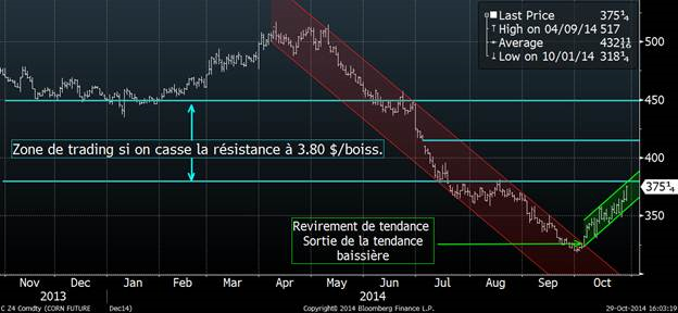 Maïs: +10 ¾ à 3.75 ¼ sur déc’14 et +7 ¾ à 4.16 ¼ sur déc’15