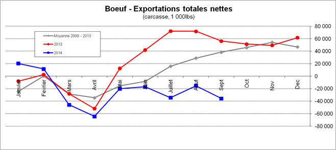 Concernant les exportations de bœuf en septembre (graphique 4), la situation reste très stable mois après mois. Les importations de viandes bovines restent inférieures à 40 millions de livres, principalement en provenance d’Australie, de la Nouvelle-Zélande et du Canada. Inversement aux ventes de porc, la récente appréciation du dollar américain joue en faveur des achats de bœuf puisque le produit est moins dispendieux aux yeux des américains.