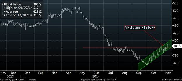 Maïs: -4 ½ à 3.81 ¾ sur déc’14 et -5 à 4.24 sur déc’15