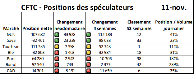 Définitivement, le prix du tourteau était devenu très volatile depuis 3 semaines (graphique 3). Bien que l’énorme récolte de fève soit presque terminée, un problème au niveau de la disponibilité des wagons de train complique la livraison du produit fini, créant une pénurie sur le marché physique malgré l’abondance de fève. On parle d’un retard pouvant atteindre jusqu’à 6 semaines pour les livraisons de tourteau. Le fait d’être dans une situation de pénurie cause vraisemblablement une situation de haute volatilité avec des variations quotidiennes de 10 à 30$ la tonne courte. La situation de pénurie a définitivement capté l’attention des spéculateurs qui ont ajouté 7 600 contrats à leur position, pour un sommet annuel de 111 500 contrats (tableau 1).