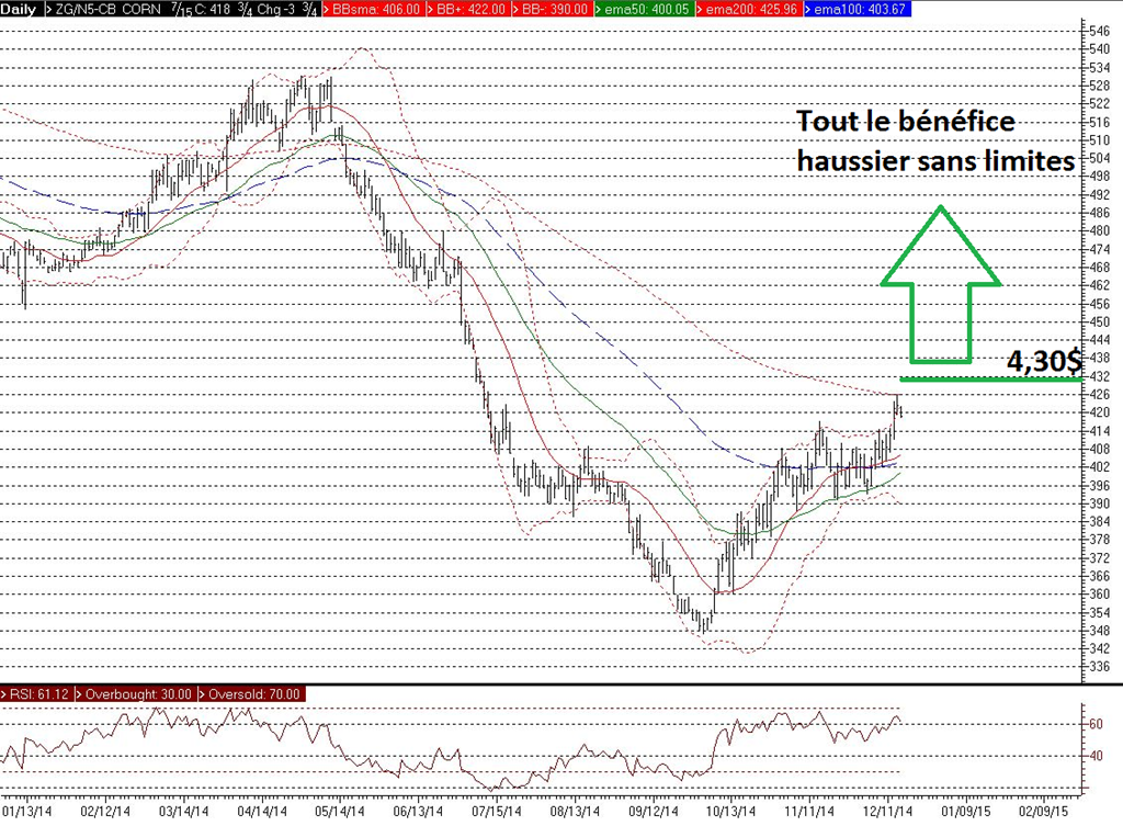 Acheter une option via votre courtier sur un mois éloigné de la présente récolte tel juillet 2015. À titre indicatif, le droit d’acheter du maïs à 4.30$ / boisseau vaut 29 cents / boisseau ou 1450 USD par contrat de 127 tonnes métriques.