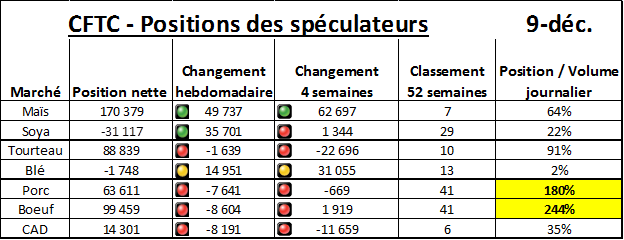 Tableau 1 – Position des spéculateurs