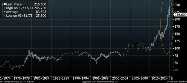 Concernant le rapport Cattle-on-feed de vendredi prochain, la moyenne des estimés se situe à 101.2% du nombre de bête en parc comparativement à novembre 2013 (tableau 2). Malgré des placements plus faibles que l’an dernier, à -3.4% selon la moyenne des estimés, ils sont amplement suffisant pour remplacer les bœufs qui ont pris le chemin de l’abattoir. La commercialisation est prévue pour être 9.8% inférieur à l’an dernier mais il ne faut pas oublier que le mois de novembre 2014 à une journée de moins qu’en 2013 ce qui cause un biais à la baisse lorsqu’on compare les 2 années. Par ailleurs, personne ne s’obstine lorsque vient le temps de débattre de l’offre limitée des bovins d’engraissement puisque les producteurs retiennent les génisses pour la reproduction. Alors qu’est-ce qui explique la chute de 15¢ du prix du feeder ? La demande est normalement plus faible lorsque vient le temps des fêtes ce qui explique les placements plus faibles en décembre versus les 2 mois d’avant. Aussi, les prix en octobre et novembre étaient excessivement élevés en raison de la rareté des veaux et de la forte demande pour remplir les parcs d’engraissement en prévision de la commercialisation pour l’été prochain. Finalement, il faut relativiser. Le prix du feeder a explosé depuis 2012, la récente chute n’est pas si dramatique lorsqu’on la compare avec son ascension (graphique 1)