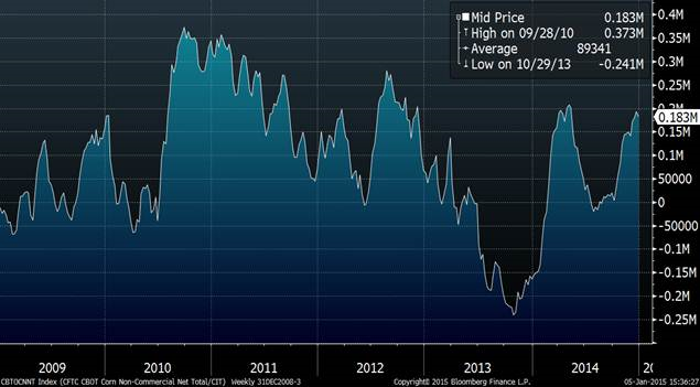 Rappel à l’ordre du rendement. Certain experts ont parlé d’un rendement de 178 ou même 180 boisseaux à l’acre vers la fin de l’été. Cependant des états comme l’Iowa et Minnesota n’ont pas enregistré d’aussi fort potentiel de rendement en fin de parcours si bien que l’USDA nous donne plutôt 173.4 en moyenne nationale. Statistiquement, la variation du rendement entre décembre et en janvier ne suggère pas une révision aussi grande et le rendement devrait plutôt se situer entre 171-175.