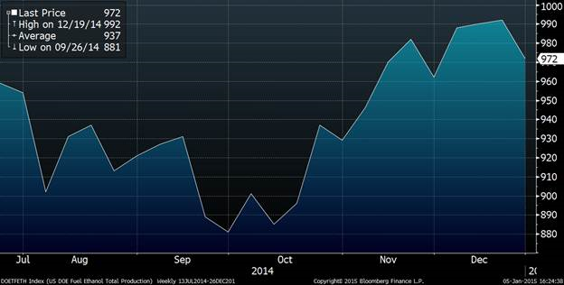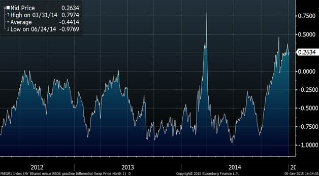 L’éthanol, la gazoline et le baril de pétrole. Plusieurs facteur expliquent la baisse violente des prix de l’énergie mais c’est en majeure partie dû à la surproduction des pays de l’OPEP. L’offre dépasse clairement la demande et les stocks s’accumule à un rythme effréné. L’éthanol est depuis 2008 utilisé comme substitut à la gazoline (mandat) jusqu’à 10% dans le mix d’essence. Disons que c’est une subvention déguisée mais qui n’est pas dénoué de sens au plan économique puisqu’habituellement l’éthanol est moins cher et que son indice d’octane est élevé. Bref, c’est rentable de blender. Actuellement ce n’est plus autant le cas puisque le gallon d’éthanol vaut plus que le RBob. Il existe toujours une rentabilité à produire, notamment avec la revente des drèches, mais le visage de l’industrie ne sera plus le même si ces conditions perdurent. Le graphique suivant montre une prime de 26 cents le gallon pour l’éthanol.