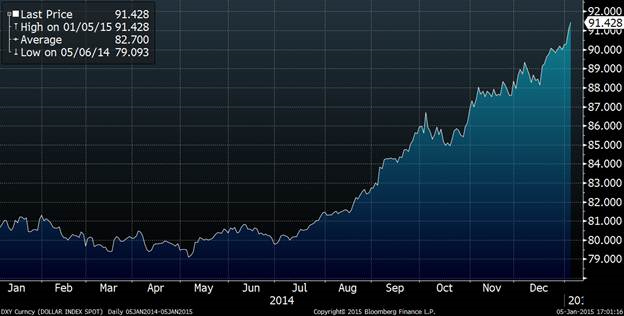 Pour ce qui est des exportations américaines, elles sont pour l’instant en ligne avec les prévisions de l’USDA. Le défi majeur dans les mois à venir sera sans l’ombre d’un doute la force du billet vert. Les plus importants partenaires commerciaux sont le Japon (24.3% des exportations), le Mexique (21.5%), la Corée du Sud (10.2%) et la Chine incluant Taiwan (8%). Le Yen et le peso ont subi de forte dévaluation depuis des mois si bien que les importations en provenance des États-Unis ont fortement chuté. Une bonne indication de la force du dollar américain est le Dollar Index. Je pense que le graphique suivant parle de lui-même. Le taux de change ne porte pas réellement problème pour les exportations qui sont déjà confirmées, mais celles qui ne le sont pas encore vont couter drôlement plus cher. L’USDA prévoit des exportations 2014/15 à 44.45 millions de tonnes. Au 25 décembre dernier, un total de 26.9 était soit déjà exporté (12.1) ou promise (14.8) à l’international. C’est donc dire que près de 40% ou 17.55 million de tonnes reste à commercialiser pour le reste de l’année dans des conditions possiblement difficile.