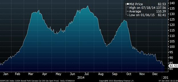 La valeur de la carcasse (200lbs) est évaluée à 82.53 cents la livre, en baisse aujourd’hui encore.