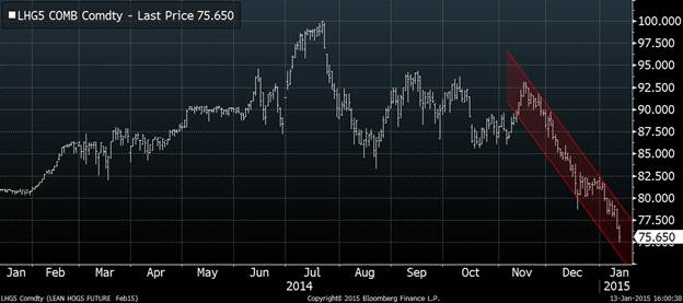 Contrairement à la normale, le prix cash du porc est dans une pente descente depuis le début de 2015 à 76.71¢/lb ce qui entraine le prix des livraisons de février à la baisse, touchant 75 ¢/lb aujourd’hui (graphique 1). La situation a bien changé en seulement quelques semaines : d’une part, les abattages commencent 2015 sur un ton positif avec plus de 2.16 millions têtes la semaine dernière ce qui est 3.5% de plus qu’à pareille date l’an dernier. Depuis plusieurs mois, nous avions un volume d’abattage sous les niveaux de l’année précédente ce qui n’était pas totalement compensés pas le poids plus élevé des carcasses. Par contre, avec des carcasses à 215 livres, cela s’additionne à la hausse des abattages pour une production 4.1% plus élevée en livres… ce qui met de la pression négative sur le prix pour l’instant. Il faut dire que ce sont des porcs qui ont vu le jour pendant l’été alors que le prix du porc avait explosé et celui du maïs s’était effondré, permettant à la porcherie de fixer des marges record pour une augmentation de sa production. Face à cette large disponibilité, les abattoirs réussissent à augmenter leur marge opérationnelle qui est à 16$/tête, en hausse de 6$ depuis une semaine.