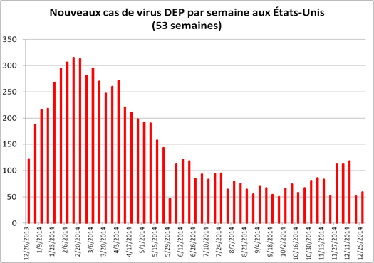 Finalement, les cas de DEP avaient commencé l’hiver sur une tendance inquiétante touchant plus de 100 cas par semaine pendant 3 semaines. Cependant, la situation s’est rapidement corrigée avec 51 et 59 nouveaux cas pendant les 2 dernières semaines de décembre (graphique 2). À priori, si la situation avait dégénérée comme l’hiver dernier, cela aurait été positif pour les prix de l’été prochain, mais l’impact du virus de cet hiver s’en ligne pour être moindre… donc meilleur pour la productivité des truies ce qui s’additionnera à la hausse des mises-bas, prévue à plus de 3% selon les intentions sondées par l’USDA. En somme, l’été dernier avait été très profitable pour l’industrie porcine et on commence à ressentir les conséquences de l’expansion de la production prévu pour 2015.