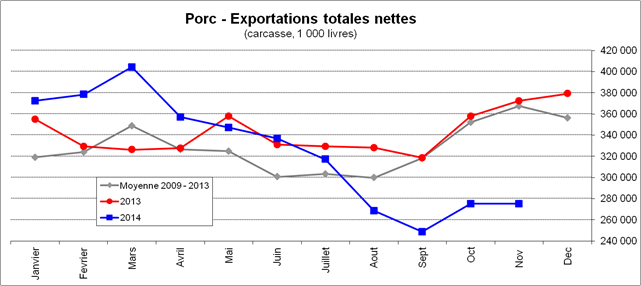 En plus d’une production plus forte, la demande extérieure diminue en raison du fort dollar américain laissant plus de viande sur le marché américain. Les exportations du mois de novembre dernier sont 26% inférieures à la quantité de novembre 2013. C’est le Japon et la Chine qui ont diminué leur achat aux États-Unis, à eux seuls, ils représentent plus de la moitié de la baisse des exportations nettes. En plus de vendre moins, les États-Unis achètent d’avantage du Canada ce qui augmente l’offre de viande. Bref, les exportations nettes de porc étaient de 275 millions de livres en novembre 2014 comparativement à 372 millions en 2013 (graphique 1). Considérant que les exportations de porc représentent 20% de la demande américaine, une baisse annuelle de 25% des ventes causerait une augmentation de l’offre en territoire américain de 5%.... Supposons que les ventes extérieures actuelles sont similaires à octobre et novembre, on a ce 5% plus de porc via la baisse des exportations en plus de la production plus élevée de 4%, pour une somme de 9% de plus que l’an dernier !! On est loin du déficit de l’été dernier.