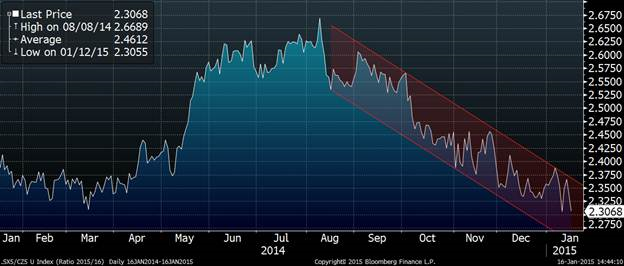 Graphique 2 – Ratio Soya nov’15 / Maïs déc’15 (2.30 signifie que le soya est 2.30 fois le prix du maïs)