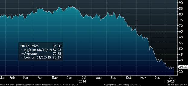 Depuis le 9 septembre 2010, le taux directeur au Canada était à 1.00%. Hors de toutes attentes, la Banque du Canada a décidé de diminuer le taux à 0.75% afin de stimuler notre économie et ainsi atténuer le choc lié à la chute de prix du pétrole. Le prix du pétrole canadien, lequel est moins cher que le pétrole WTI des États-Unis en raison de sa qualité moindre, a chuté de 80 $US/baril en septembre à seulement 34 $US (graphique 1). Cela engendre une baisse de la valeur des exportations ce qui est négatif pour la croissance économique, d’où le besoin d’un stimulus monétaire selon la Banque du Canada. Conséquemment, le taux de change entre le dollar canadien et américain s’est déprécié de 2 % à 0.809 CAD/USD (1.236 USD/CAD). Pourquoi est-ce que le taux de change réagit à cette nouvelle ? C’est que les investissements au Canada deviennent moins attrayants, les investisseurs rapatrient donc leur argent pour le réinvestir ailleurs où les rendements sont meilleurs, vendant leur dollar canadien pour acheter d’autres devises.