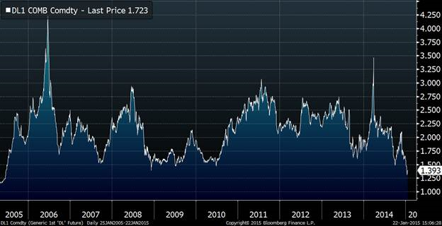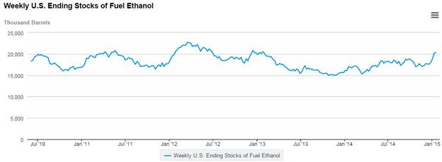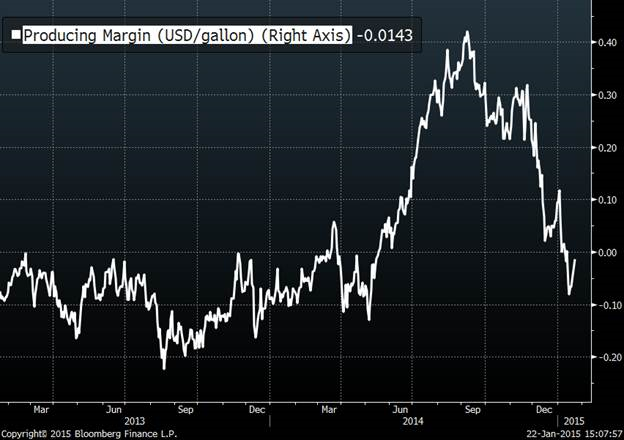 La production américaine d’éthanol bat de son plein depuis le mois de novembre avec une production moyenne de 973 000 barils par jour. Au point actuel, il ne faut que 919 000 barils par jour durant les 33 semaines restant de l’année commerciale 2014/15 afin d’atteindre les prévisions de l’USDA. Ça semble donc bien aller dans la fabrication d’éthanol laquelle devrait représenter 38% de la demande totale de blé d’Inde. Par contre, ce n’est pas si rose lorsqu’on constate qu’il y a un surplus de production et que les inventaires augmentent à un rythme fou! Juste pendant la semaine du 9 janvier (publié aujourd’hui), les inventaires ont passé de 18.85M barils à 20.23M (graphique 1), soit une augmentation de 7% en seulement une semaine. C’est la première fois en 2 ans que les stocks d’éthanol dépassent les 20M barils et cela ne laisse pas le prix du biocarburant indifférent. Les contrats d’éthanol sont à 1.39 $US/gallon en date d’aujourd’hui mais étaient légèrement plus bas en début de semaine, à son plus faible prix depuis 2005 (graphique 2). Faut comprendre que la marge opérationnelle était intéressante jusqu’au début décembre (graphique 3) ce qui incitait les raffineries d’éthanol à augmenter leur production vers la fin 2014 et elles ont gardé le rythme depuis. De plus, le prix de l’éthanol reste légèrement supérieur au prix de la gazoline ce qui fait monter la valeur des RINs 2015 (Renewable Identification Numbers), maintenant à 0.69 $US/gallon.
