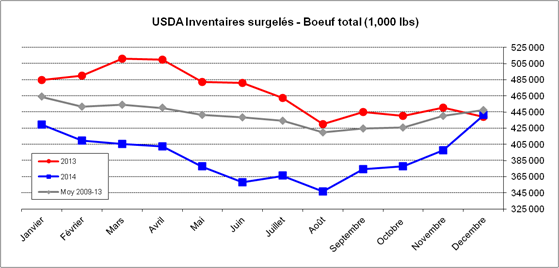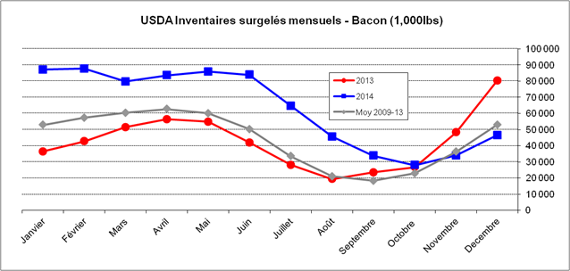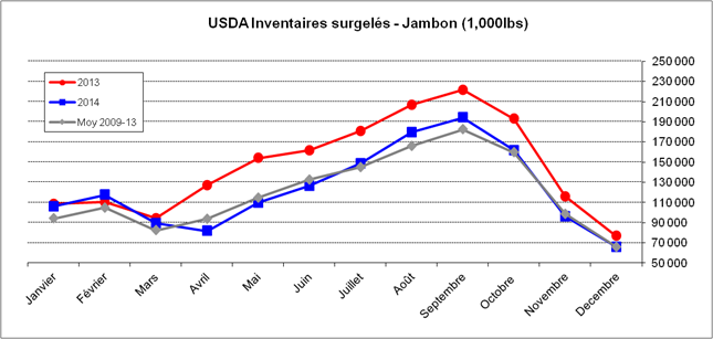 Par ailleurs, il y avait la publication des inventaires surgelés où on note un retour à la normale dans les inventaires de bœuf au 31 décembre, après un large déficit de -25% en juin (graphique 4). Plus de 40M de livres de bœufs se sont empilées durant le mois de décembre ce qui est très inhabituel et pourrait refléter une baisse de la demande ce qui coïncide avec la baisse du prix. Concernant les inventaires surgelés de porc, à près de 500M livres, on maintient un déficit de 10% avec les stocks de décembre 2013, mais on est de retour à la moyenne des 5 dernières années (graphique 5). Parmi les coupes, il y a 42% moins de bacon dans les congélateurs que l’an dernier, mais c’était plutôt en 2013 que la situation sortait de l’ordinaire (graphique 6). Pour la coupe de jambon, on est au plus bas niveua depuis décembre 2011 (graphique 7) à 66M lbs, il semblerait que le jambon était à la mode pendant le temps des fêtes.