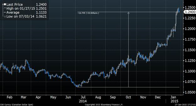 Le point positif pour le producteur canadien est que l’indice de référence est américain, et donc le taux de change actuel éponge une partie de la baisse de la valeur de la production. En dollar US, les contrats de juin ont chuté de 18.84% depuis le 24 novembre tandis que sur la même période mais en dollar canadien la baisse est de 10.79%. Depuis le mois de juillet, le dollar canadien s’est fortement dévalué ; 100$ US vaut maintenant 124.00 $CAD, c’est une variation de +16.70%. Oui les grains valent aussi plus cher, mais l’effet net dans l’entreprise canadienne demeure positif.