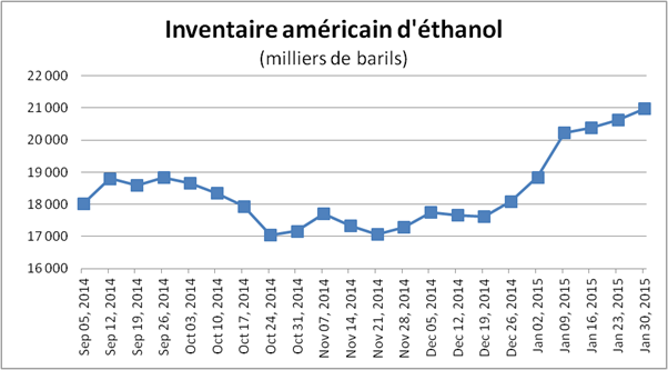 Hier, le prix du maïs a bondi de 4% et celui du soya de 3% mais peu de changement vient expliquer un tel revirement. Résultat : retour à la case départ pour le soya et une petite baisse pour le maïs qui n’a toujours pas sorti de sa tendance baissière (graphique 1). La hausse des prix d’hier pourrait être expliquée par une mauvaise performance journalière du dollar américain ce qui est bon pour l’ensemble des matières premières puisqu’elles sont libellées avec le billet vert. Concernant la demande du maïs, la production d’éthanol de la semaine du 30 janvier était la plus faible depuis 3 mois à 948 000 barils par jour (graphique 2). Nous restons tout de même largement au-dessus du minimum nécessaire pour atteindre la prévision de l’USDA soit 915 000 barils par jour. Si la production journalière reste au tour de 975 000 barils par jour comme ces dernières semaines, cela viendrait gruger près de 200M de boisseaux à l’inventaire américain, presque 10%! Par contre, la marge opérationnelle est à zéro depuis le début de l’année ce qui ne stimule pas la production. De plus, les inventaires d’éthanol sont à leur plus haut niveau depuis juin 2012 et ne cesse d’augmenter depuis plusieurs semaines (graphique 3). Les inventaires les plus élevés enregistrés étaient à 22.7M barils (mars 2012) et nous progressons lentement vers cette quantité avec près de 21M barils à la fin janvier.